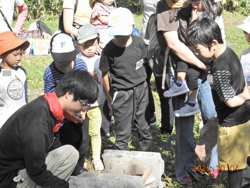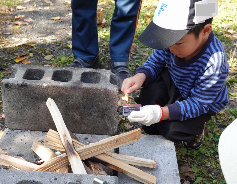 班ごとに分かれて、まずは焚火をつけます。つけ方教えるよ~。