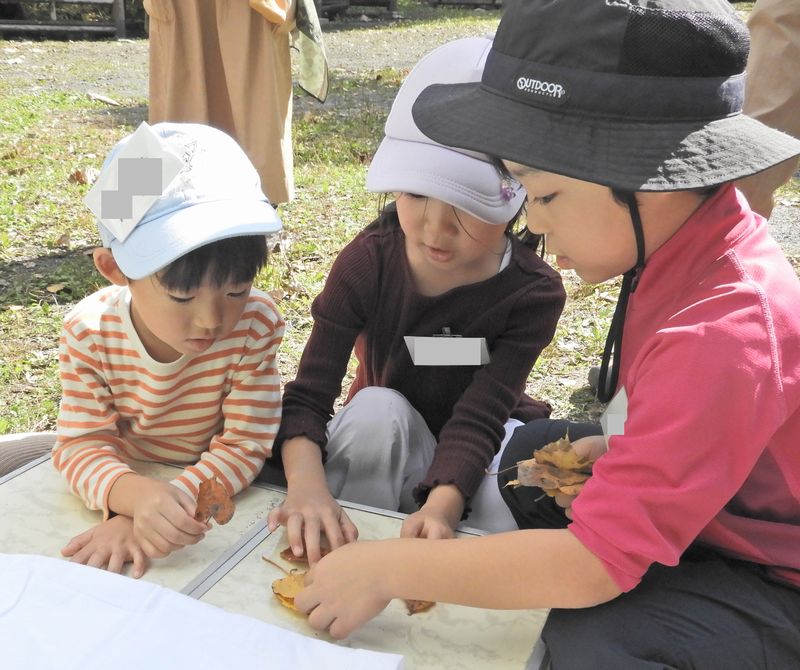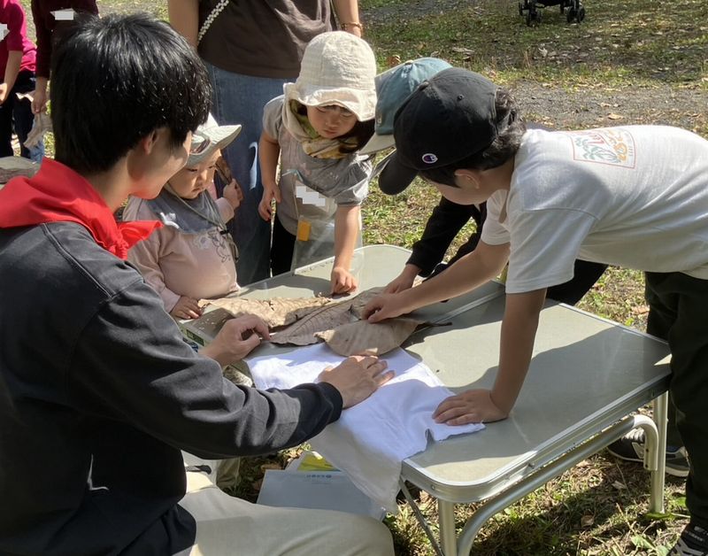 午後は、落ち葉の観察からスタート。同じ葉っぱ見つけてね。みんな一緒の大きなホオノキの葉っぱ♪
